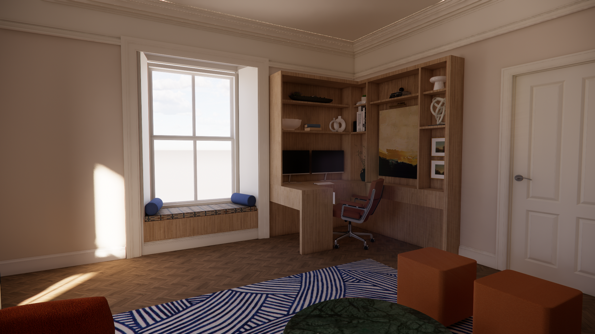 The Ashford living room and office were designed as a flexible, well-balanced space that supports both work and relaxation. A calm palette, thoughtful zoning and considered details create a room that feels focused yet comfortable — allowing the space to adapt easily to everyday living.